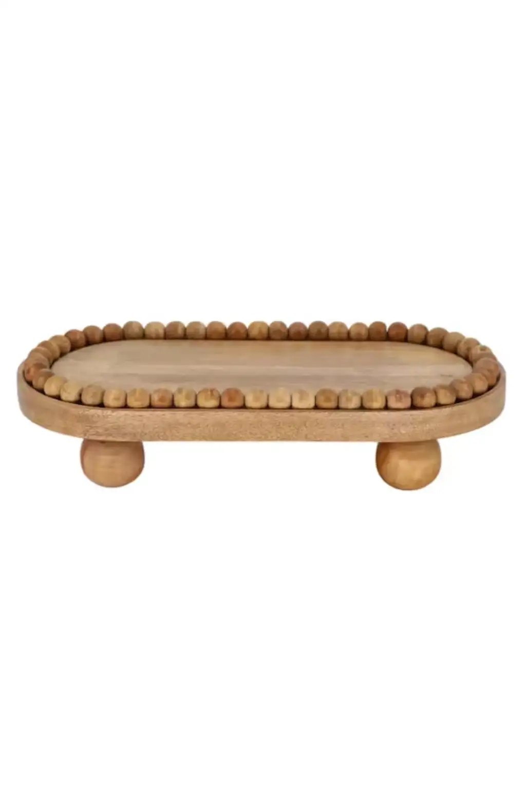 Charola decorativa de madera con un diseño de esferas que enmarca la pieza. Ideal para centros de mesa con carácter orgánico.